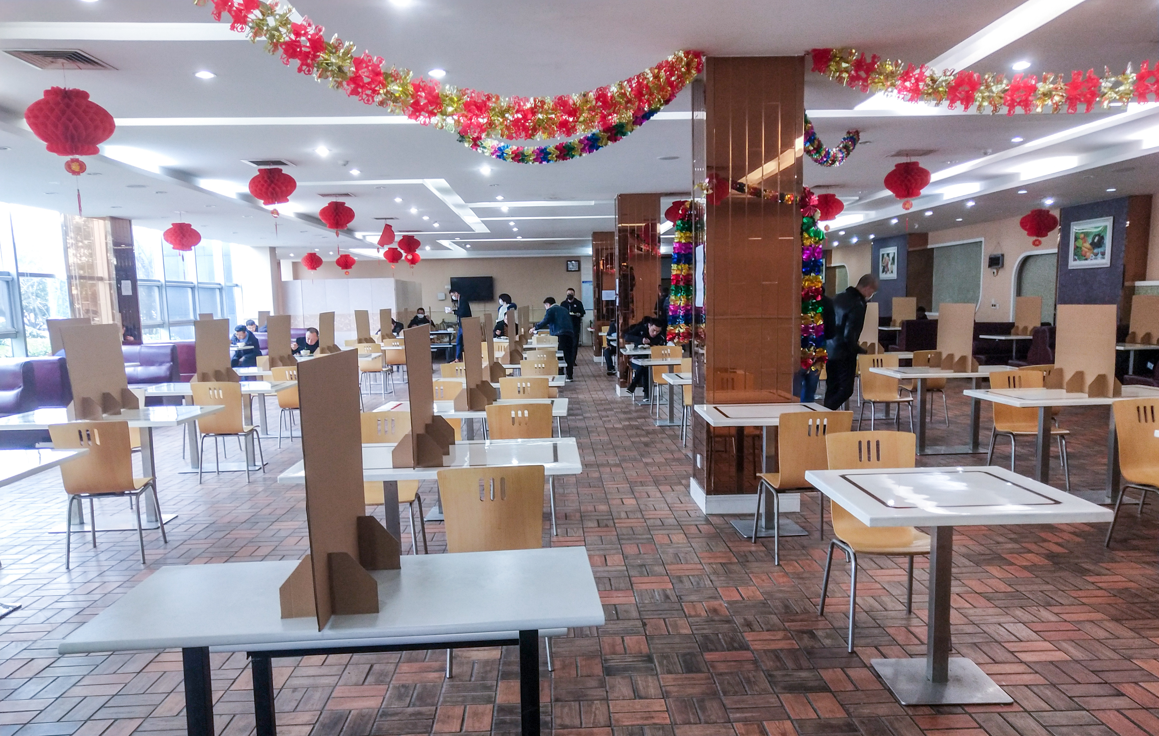 公司食堂實行人員錯峰分流措施,員工就餐分時分批、限時限流,避免人員在食堂中聚集,進食堂前需檢測體溫,排隊取餐需間隔一米,每桌限坐2人,中間用板隔開,且一律同向而坐,避免隔桌交談。